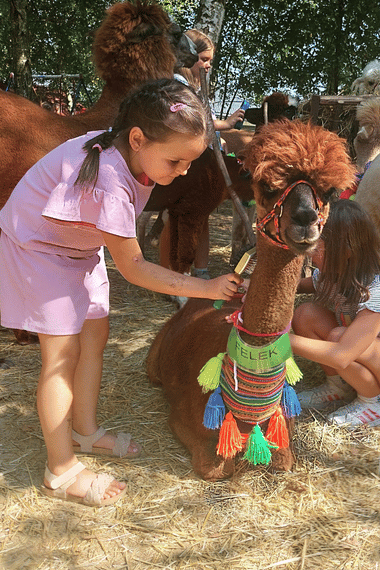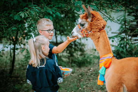 Opowiadamy o alpakach –  co jedzą, skąd pochodzą i wiele więcej. Dzieci uczestniczą w różnych aktywnościach m.in. karmią i przytulają zwierzęta.